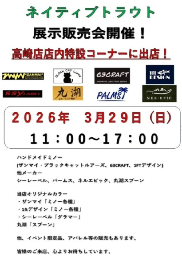 〈イベント情報〉3月29日(日)*ネイティブトラウト展示販売会 2026年3月16日 イベント出展のお知らせです🐟 【イベント告知】日時:2026/3/229日) 11:00~17:00(予定)場所:サンビーム高崎店様《イベント内容》セミドライソックス試着会&ネル製品展示即売会を行います。当日はアンバサダーの諌山さん、営業の小泉さんが参加します!また購入特典としてノベルティをプレゼントします★皆様のご来場を心よりお待ちしております。